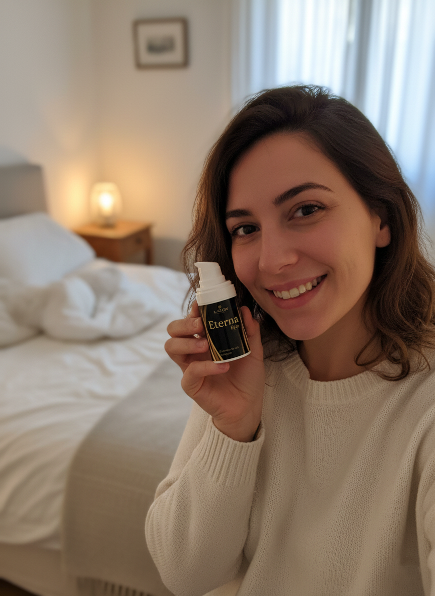 Applica un siero viso illuminante o rimpolpante (perfetto con ETERNA Serum™). Quando la pelle è nutrita, la zona occhi risponde più in profondità.